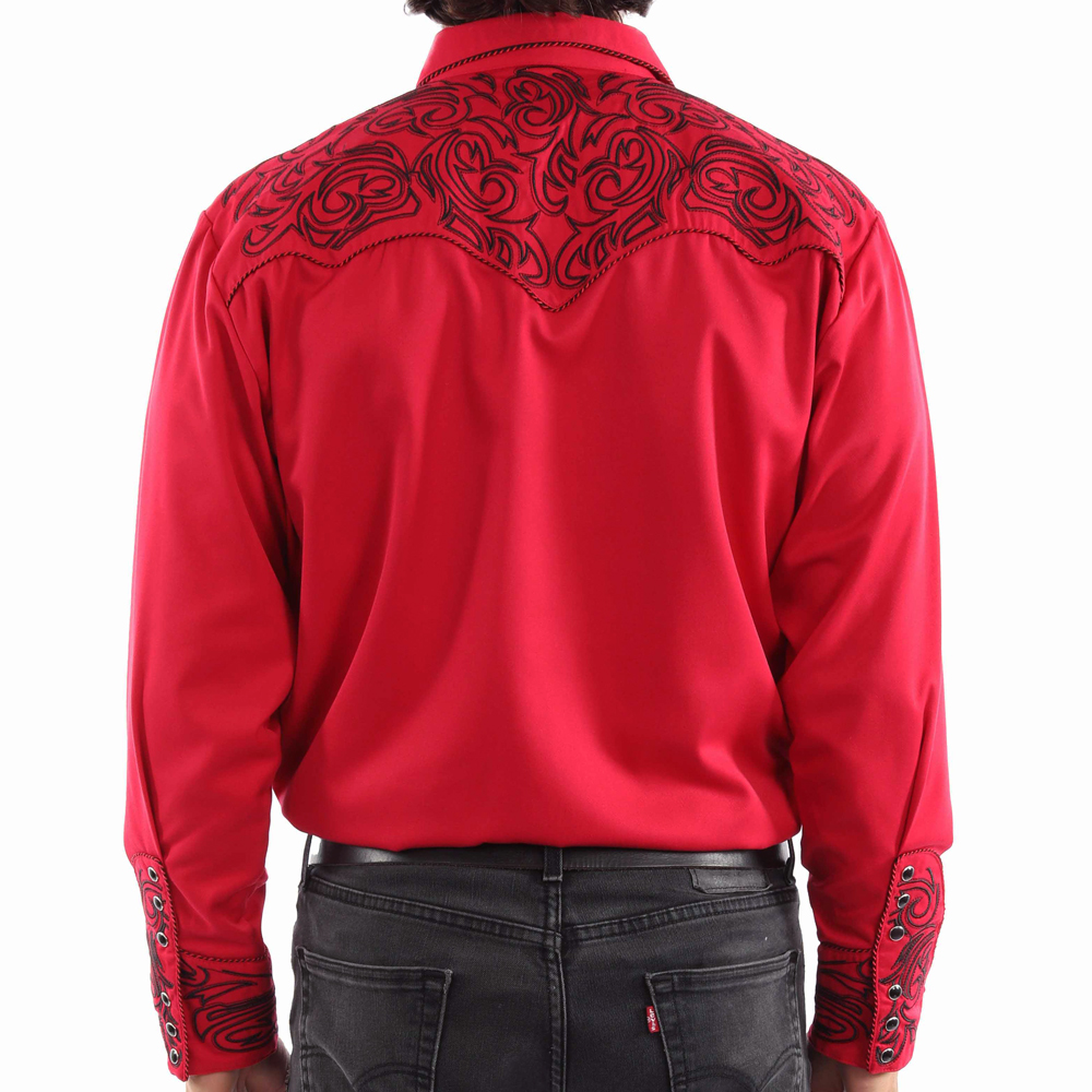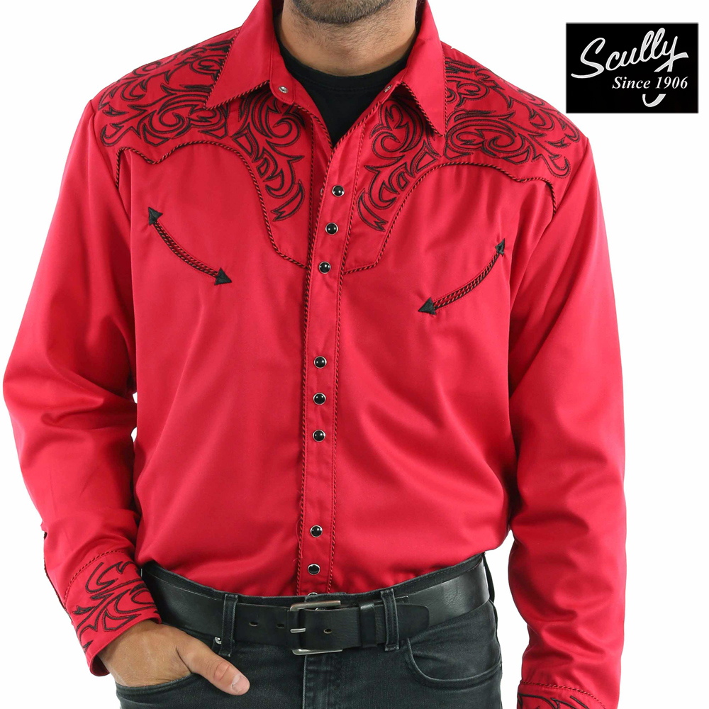 スカリー ウエスタン 刺繍 シャツ(長袖/クリムゾン・ブラック)L(身幅64cm)/Scully Long Sleeve Embroidered Western Shirt(Men's) [HEPA38]