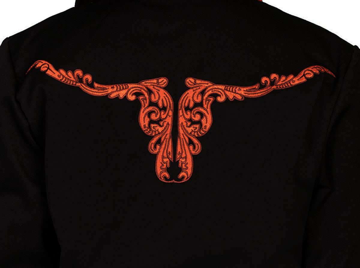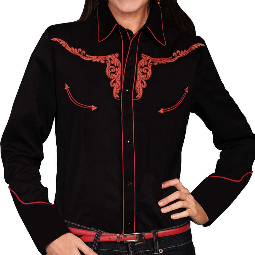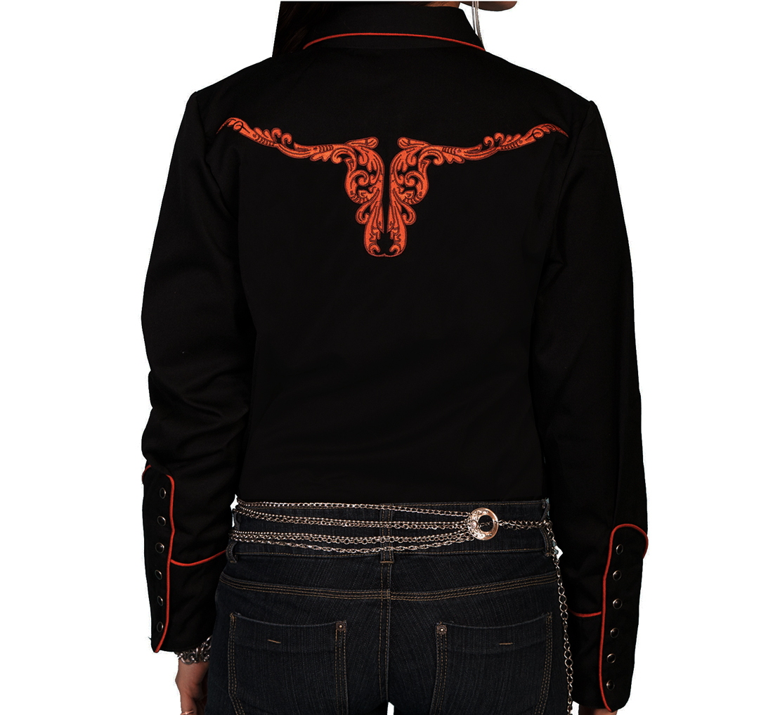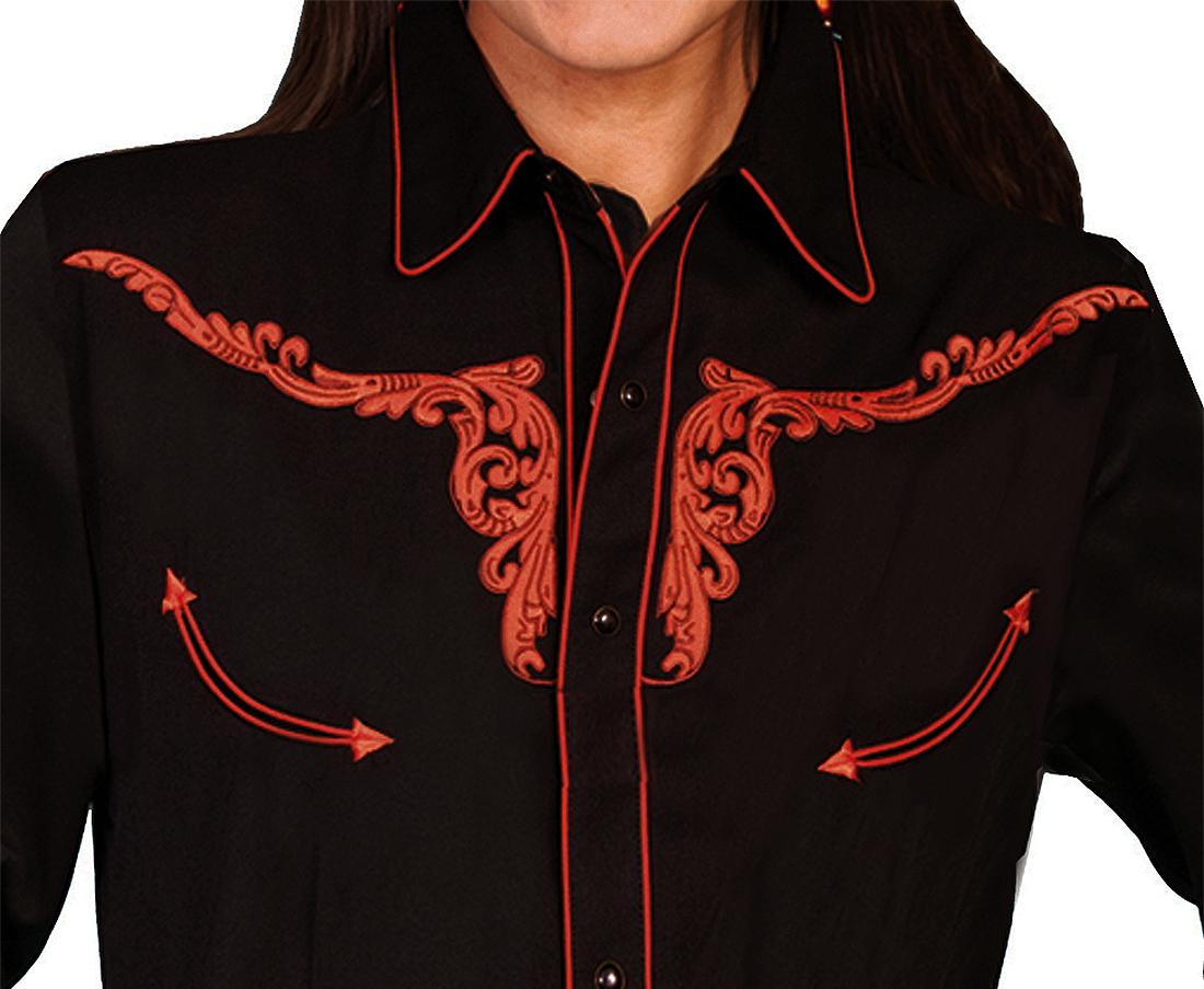 スカリー テキサスロングホーン 刺繍 ウエスタン シャツ(長袖/ブラック・バーントオレンジ)/Scully Long Sleeve Tooled longhorn design Western Shirt(Women's)