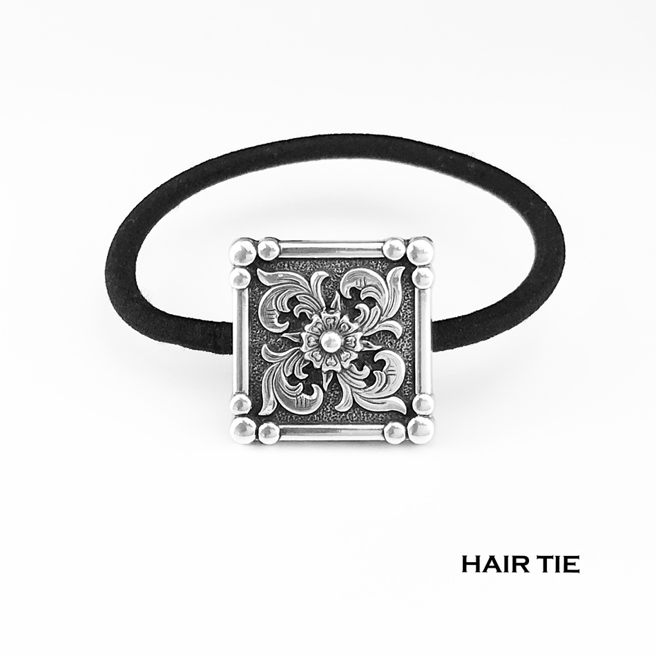 - > ヘアーゴム ヘアタイ フローラル スクエアコンチョデザイン(アンティークシルバー)/Hair Tie