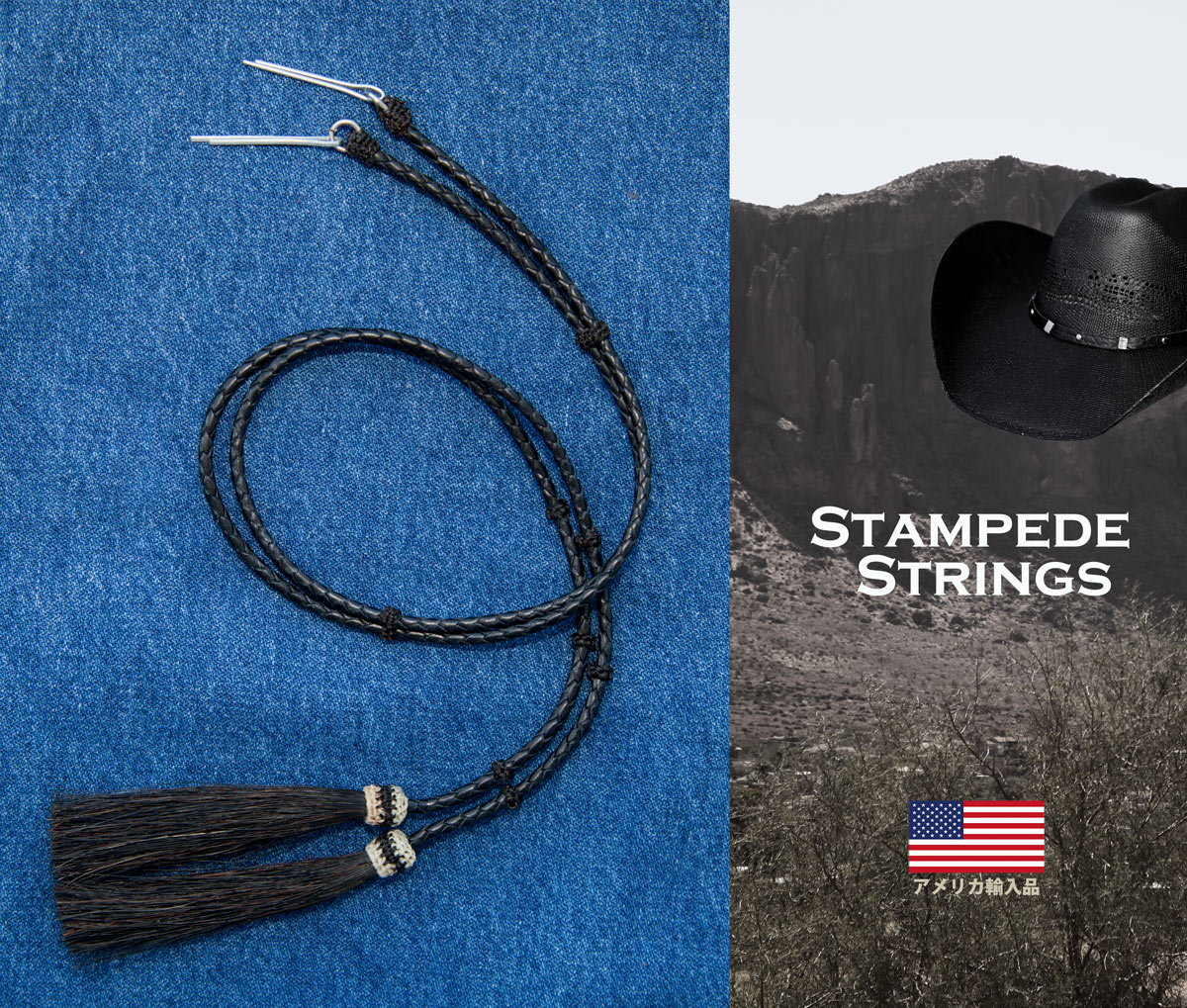 アメリカン ウエスタン レザー&ホースヘアータッセル スタンピード ストリングス ブラック・ブラック(ハット用あご紐)/Leather w/horse Hair Stampede Strings