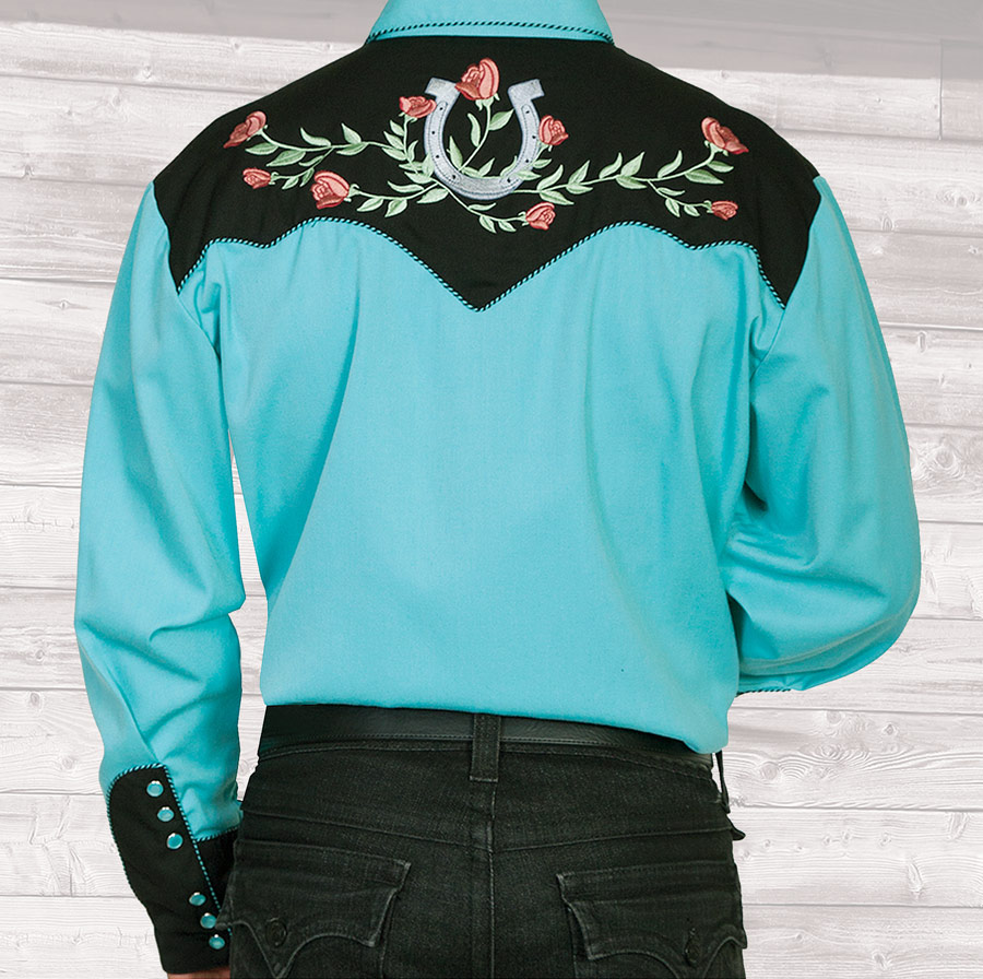 - > スカリー ウエスタン 刺繍 シャツ ホースシュー・ローズ(長袖/ターコイズ・ブラック)/Scully Long Sleeve Horseshoe Rose Embroidered Western Shirt Turquoise Black(Men's)