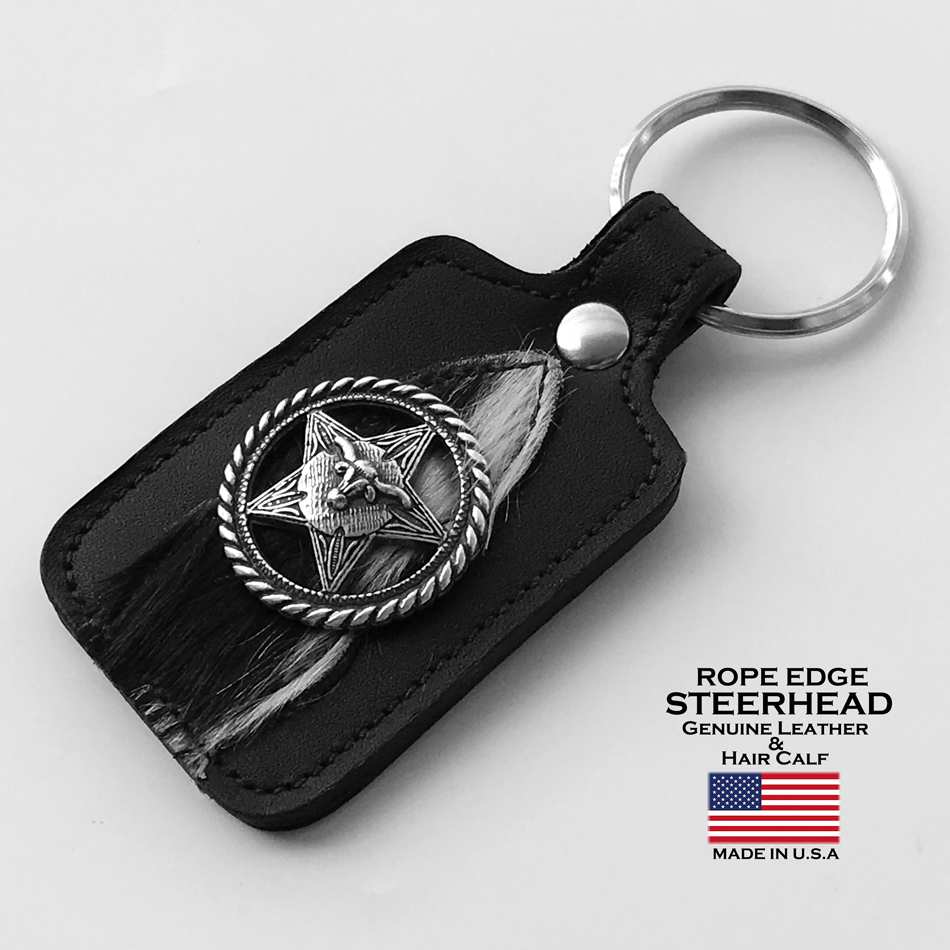 ウエスタン キーホルダー スクエア ブラック(スター&ロープエッジ ステアーヘッド コンチョ・レザー&カウヘアー)/Steerhead Western Concho Leather&Hair Calf Key Fob(Square/Black)