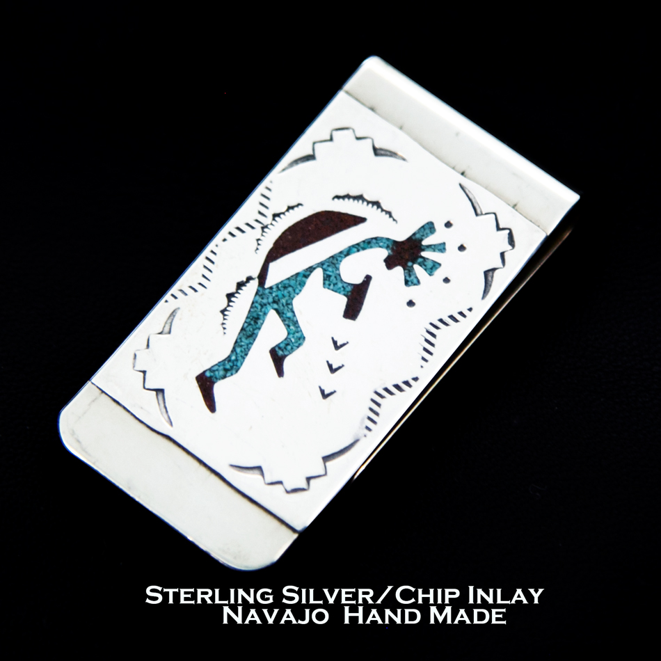 アメリカインディアン ナバホ族作 シルバー&ターコイズ・コーラル チップ インレイ ハンドメイド マネークリップ(ココペリ)/Navajo Kokopelli Chip Inlay Money Clip